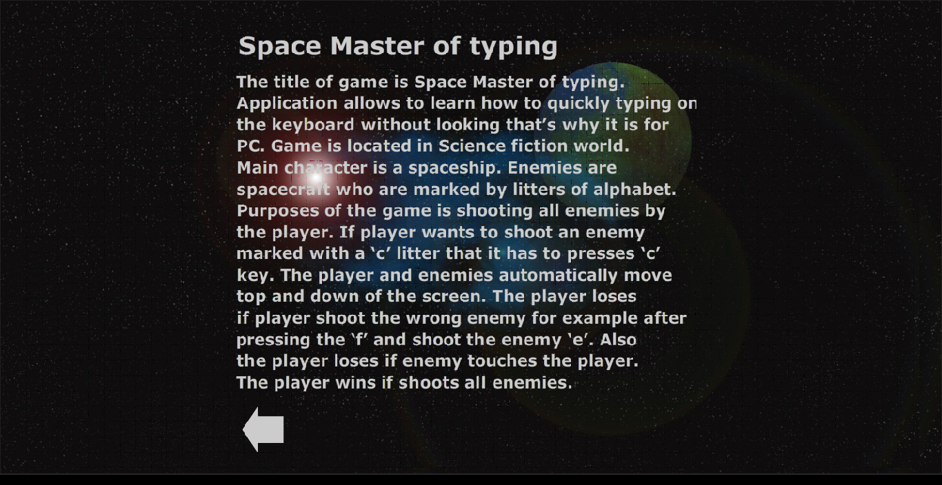 The title of game is Space Master of typing. Application allows to learn how to quickly typing on the keyboard without looking that's why it is for PC. Main character is a spaceship. Enemies are spacecraft who are marked by letters of alphabet. Purposes of the game is shooting all enemies by the player. If player wants to shoot an enemy marked with a 'c' litter that it has to press 'c' key.