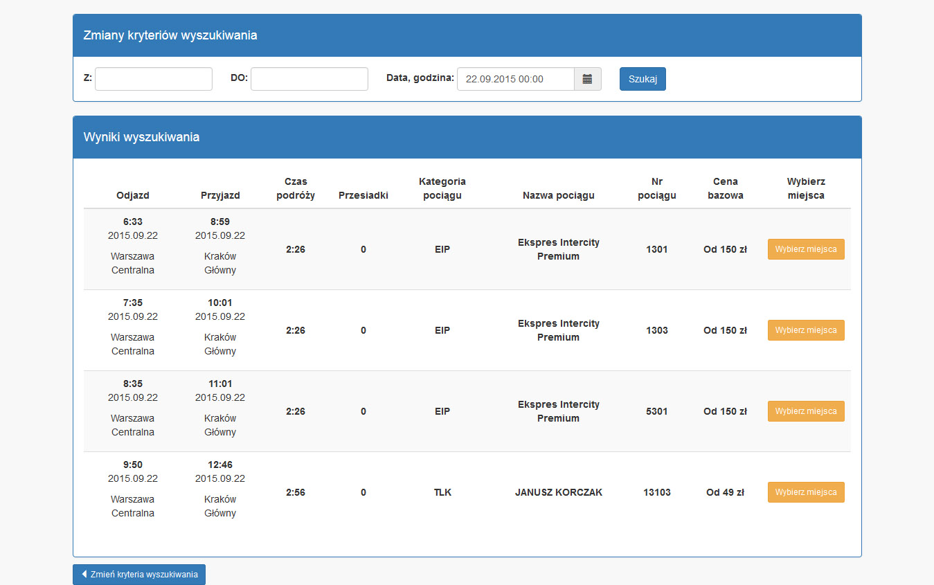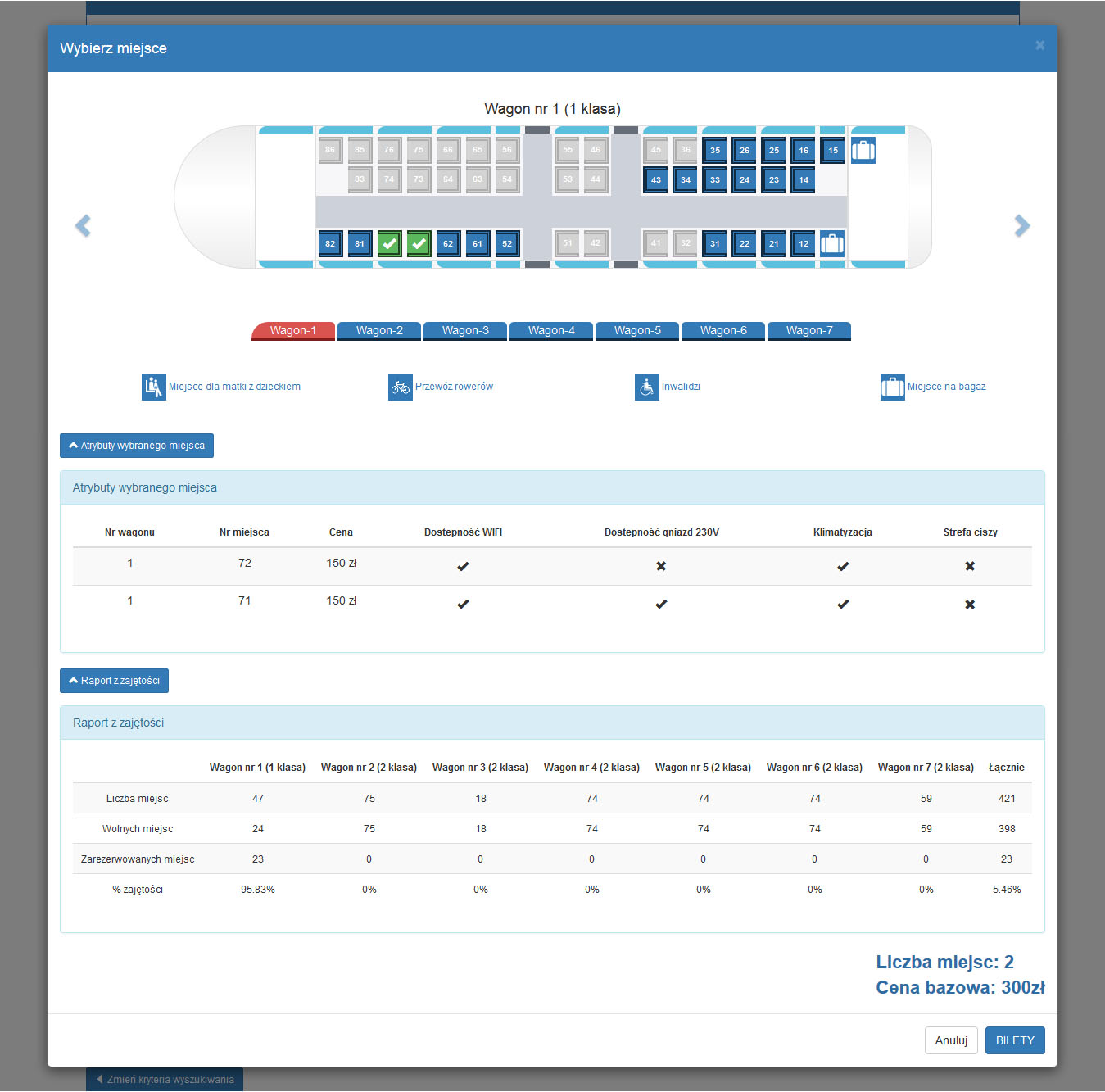 The aim of the project was to create a demo of the program for booking seats on the train. The user can search for train connections and then select the seat of interest in the compartment using diagrams that show the train carriages. The diagrams in the project were created in HTML and CSS. The application has been adapted to mobile devices.